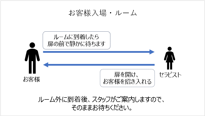 扉の前に着いたら、セラピストに開けてもらうまでそのまま静かにお待ちください。呼び鈴を鳴らす必要はありません。